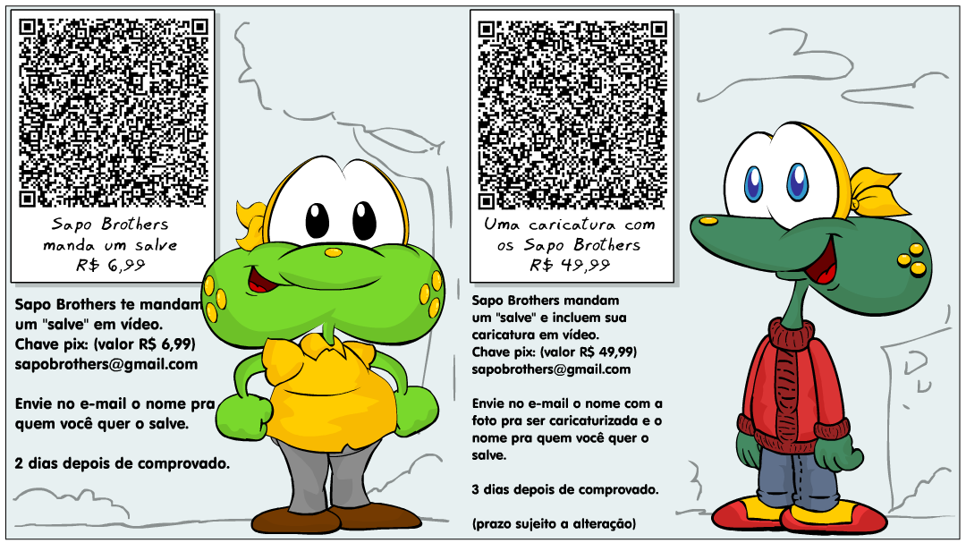![]() Quer que os Sapo Brothers mande um salve? Envie um pix de R$ 5,99 para a chave [email protected] e o comprovante para o mesmo e-mail com o nome de pra quem você quer o salve. Em até 2 dias você receberá no mesmo e-mail um videozinho com o salve dos Sapo Brothers. E se quiser que o salve tenha também uma caricatura, aí o pix é de R$ 49,99 e junto com o comprovante e o nome da pessoa homenageada, envie também uma foto de quem você quer que esteja no videozinho. Também enviaremos uma imagem PNG. |